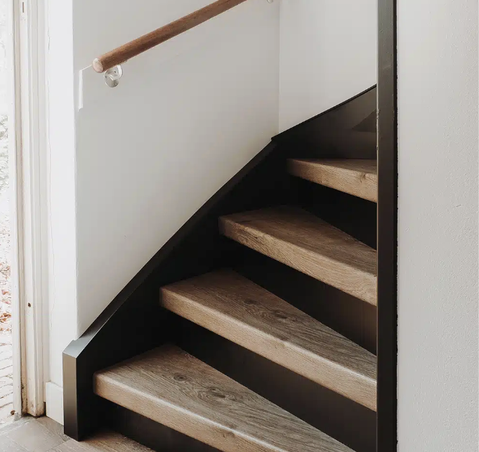 Zwart combineert ook goed met diverse houttinten. Kies bijvoorbeeld voor een eiken trap met zwarte stootborden en wangen. Zo hebben alleen de treden een houten look, kies bijvoorbeeld voor de warme ‘vintage oak’ tint voor de overzettreden. De trap oogt stoer en robuust door het zwart, maar heeft tegelijkertijd een warme uitstraling door de warme kleur van het hout.