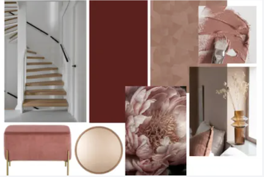 In ons blog over woontrends voor 2020 heeft u misschien al kunnen lezen dat de kleur roze weer helemaal terug is van weggeweest. We hebben het dan niet over fel roze, maar meer over een tint als terra cotta blush. Combineer deze tint met een lichtere roze tint en meubels met koperen of gouden accenten en u krijgt een prachtig geheel. Heel geschikt om in de hal toe te passen! Op het moodboard ziet u hoe alles mooi in elkaar overloopt, met de prachtige houten open trap als stralend middelpunt…