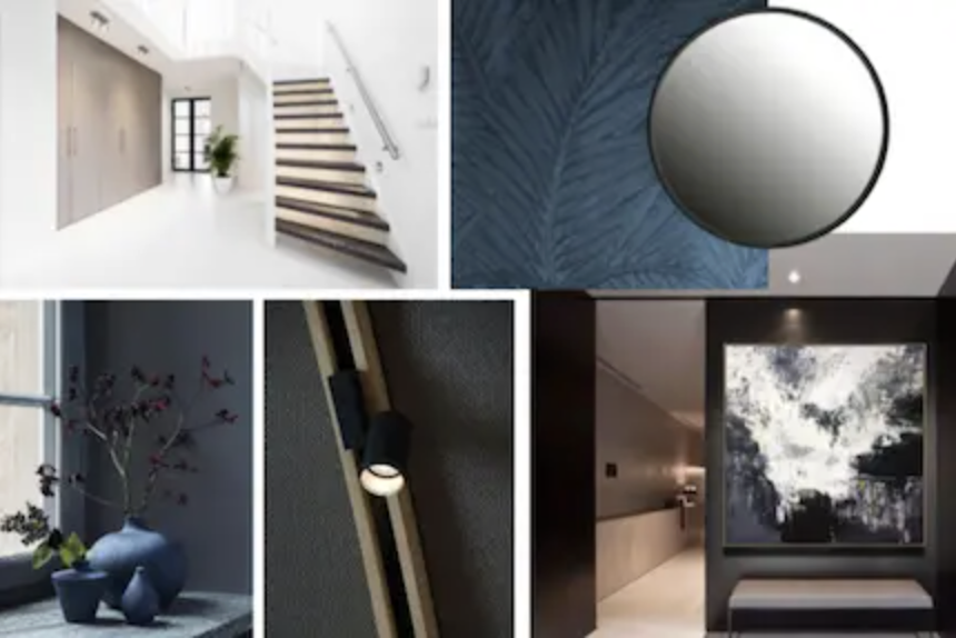 Houdt u van een stoer interieur? Dan zal dit moodboard u vast en zeker aanspreken. Op de afbeeldingen ziet u veel blauwtinten en zwart terug. Denk aan chique blauw behang met een reliëf erin, gecombineerd met bijvoorbeeld zwart gepoedercoate lampen. Voor wat meubels in de hal betreft: een metalen of draadstalen kastje past perfect in hal met een industrië look. En wat dacht u van een steen look trap gecombineerd met een rvs trapleuning? Past helemaal in het geheel!